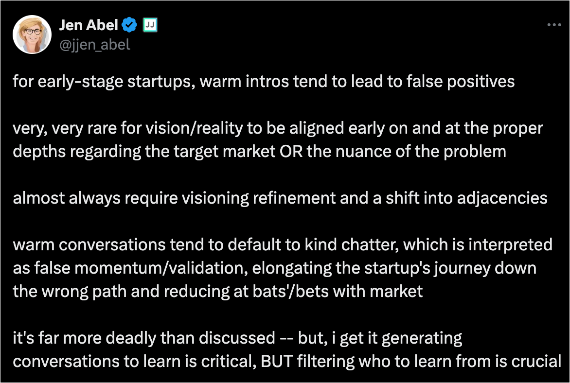 Warm intros should be qualified and disqualified using exactly the same criteria as a cold outreach. Don't get caught up spending time with someone who is happy to take your call but ultimately doesn't have a high-priority problem that you can solve.