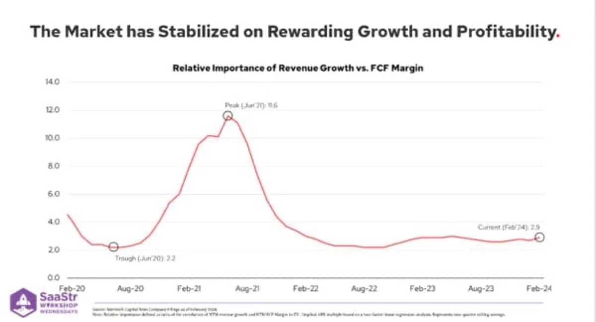 All of this is to make a larger point. You have to know who you are. I see this challenge a lot with companies that succeeded through the low interest rate period and are looking to get back to high growth. They look at Rule of 40 and say, let's get to 30% growth and 10% operating margin because investors still favor growth companies over profit-focused companies. Related, see this great chart from Logan Bartlett at Redpoint. It shows the multiple of the importance of growth vs. profitability. In February of this year, the market valued a point of growth 2.9x more than a point of free cash flow. Obviously, it's nothing like it was in 2021, but you can see that investors are still very growth-focused.