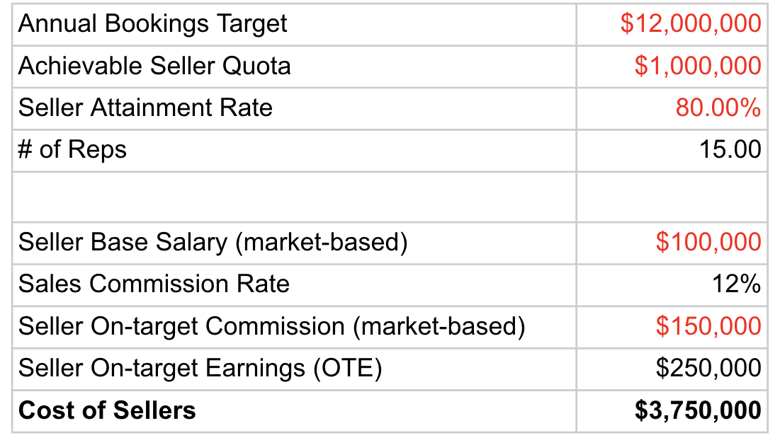 In order to recruit and retain 15 high-quality sellers, market comparables for your industry, stage, and geography, say that you need to pay each of them a total base salary of $100k and an on-target commission of $150k, meaning that if they hit their $1M quota, they have a total on-target earnings for the year of $250k.